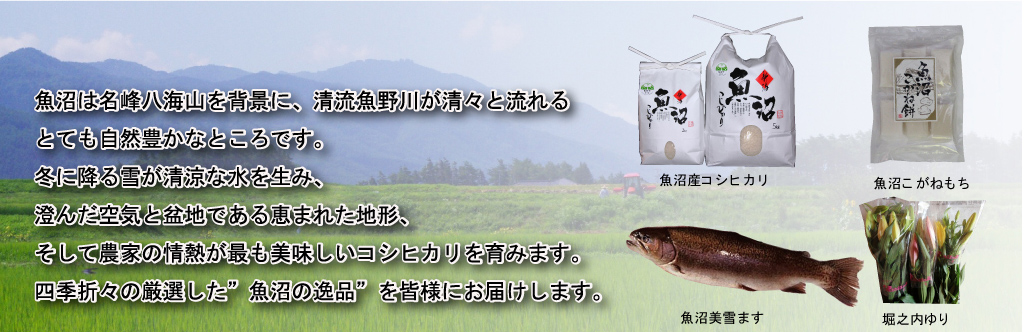 魚沼の名品お届けします!魚沼市より魚沼ブランド推奨米に認定されました。安心・安全な魚沼産コシヒカリ・天然鮎・高級百合
